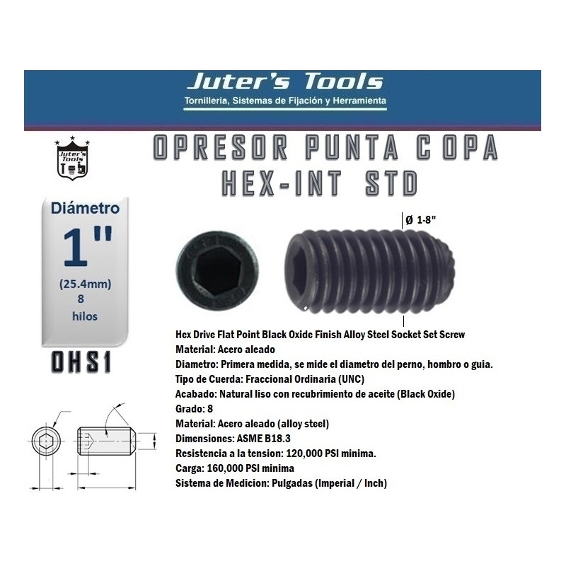 Este tipo de tornillo tiene una rosca fraccional, no incluye cabeza debido a que es utilizado para poleas o como tornillo para ba–o, en el cuerpo tiene un roscado con un hexagono en una de las puntas para apriete, en el otro extremo tiene una punta tipo copa para realizar la presion, se utiliza para bandas transportadoras y maquinaria en donde no se tenga facil acceso para llaves y la cabeza quede oculta. Permite quedar oculto a la superficie, es ideal para utilizar en maquinaria. Los tornillos allen son tornillos industriales con una mayor dureza ya que cuentan con aleacion de acero en clase 12.9 o Grado 8.